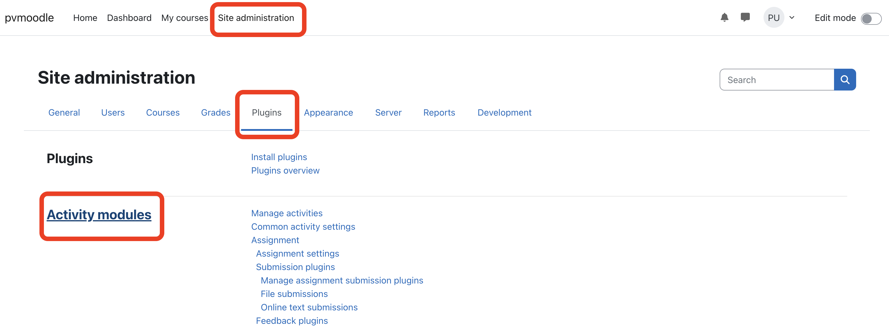 First, navigate to Site Administration > Plugins > Activity modules.
